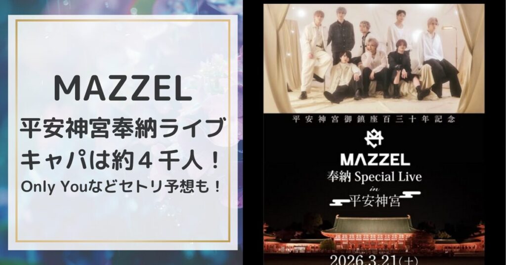2026年3月21日、平安神宮にて「MAZZEL 奉納スペシャルライブ」の開催が決定しました。現在、MAZZEL Official Fan Clubでは先行受付が行われています。 本記事では、平安神宮でのライブの想定キャパシティや、どのような内容のステージになるのかについて、... -