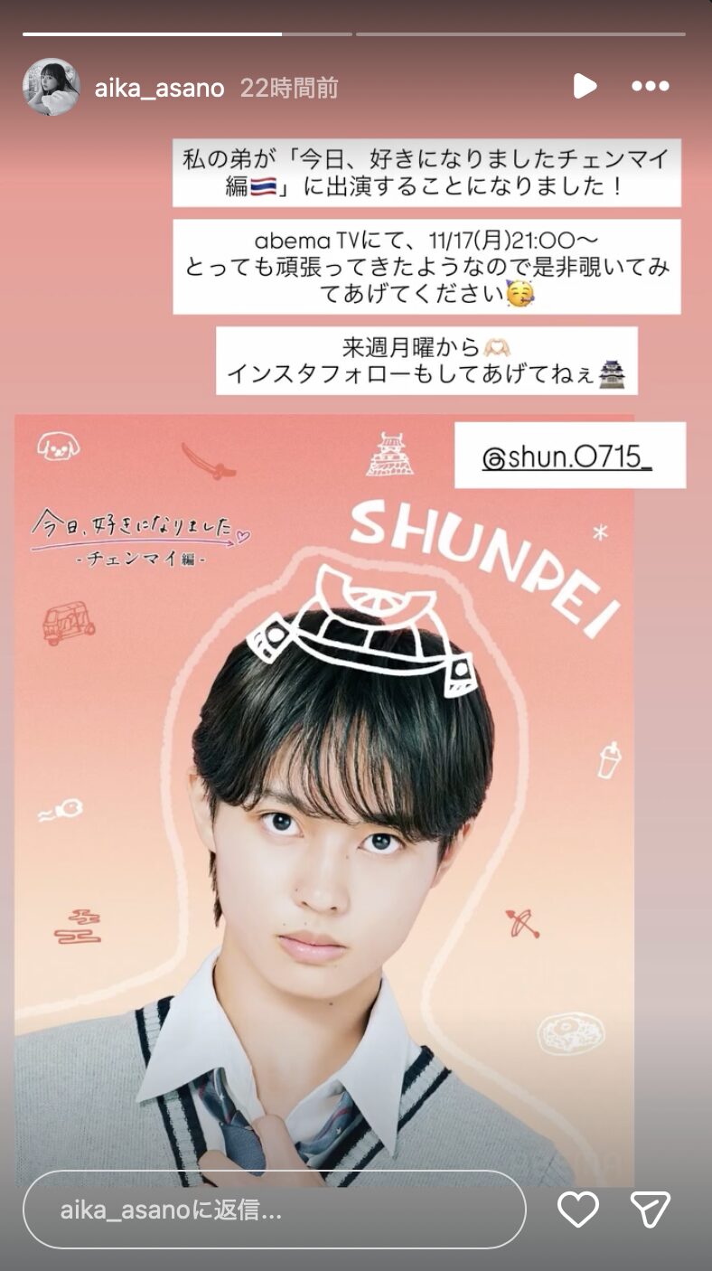 2025年11月17日から配信予定の「今日、好きになりました。チェンマイ編」に出演予定です。
