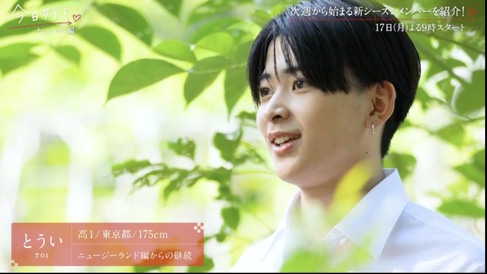 とういさんは、ミスターコン出場や短編映画出演経験を持つ「今日好きニュージーランド編」の継続メンバーで、現在は「今日好き。チェンマイ編」に出演予定です。