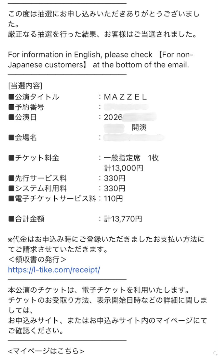 チケットの抽選申し込み後、当選・落選の結果が記載されたメールが届きます。