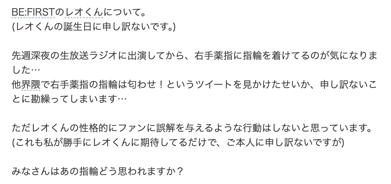 今回ご紹介したように、BE:FIRSTのレオさんと横田真悠さんの熱愛匂わせとされる話題には、ギャル曽根さんへの出産祝いの包装が似ていたことや、レオさんの右手薬指の指輪の噂など、いくつかの出来事が重なっています。