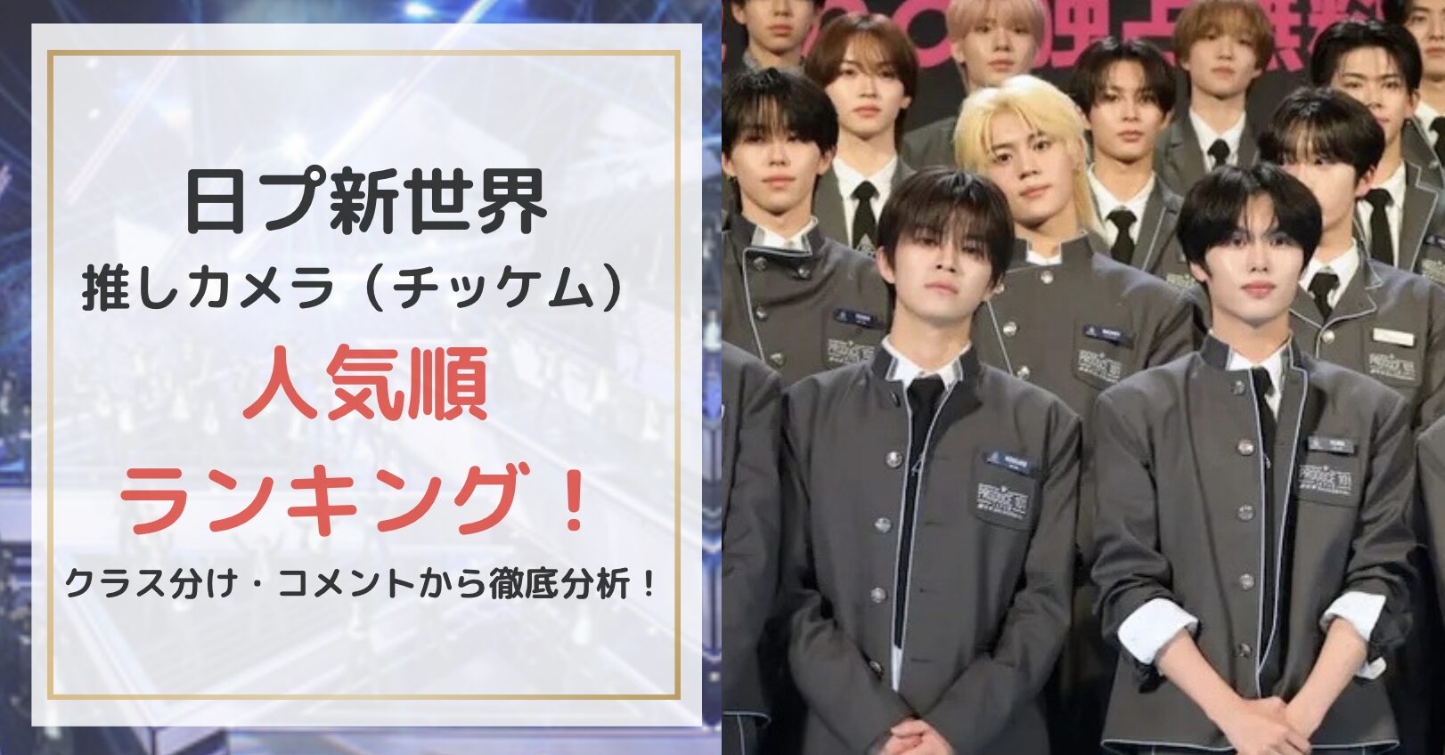 今回、推しカメラ(チッケム)の「いいね数」を元に人気ランキングをまとめました。また、YouTubeコメントをもとに、上位25名の練習生がなぜ支持を集めているのかを整理してきました。